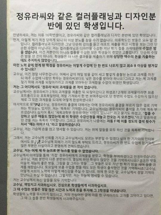 또 “교수님께서는 정씨의 출석을 초기에 계속 부르셨다”며 “심지어 ‘혹시 체육과학부 정유라 아는 사람이 있느냐’고 묻기도 하셨고, ‘컬플 수강하고 싶은 애들도 많았는데 왜 수강신청 해놓고 안 오는지 모르겠다’ ‘자동 F에 이를 정도의 결석 횟수가 차서 얘는 F’라고 말씀하셨다”라고 회상했습니다.