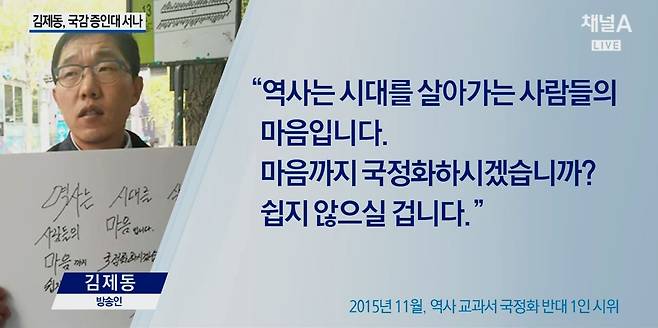 | ▲ 역사교과서 국정화 반대 하고 있는 김제동 씨 채널A <이슈투데이>(10/6) 화면 갈무리 |