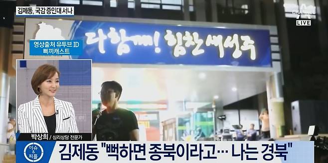 김진(진행자) : "김제동씨가 "국감에서 부르면 내가 나가겠지만, 감당할 준비가 되어 있냐"라고 큰소리를 땅땅 쳤는데. 그 '감당할 준비가 되어있냐'는 의혹은 '일과시간 이후에 내가 회식자리에서 사회를 봤다' 그거 하나죠."