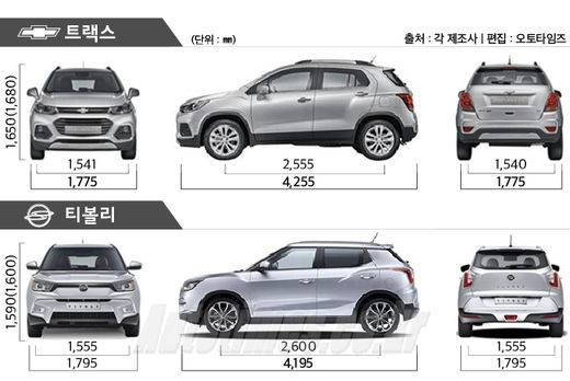트랙스는 길이 4,255㎜, 너비 1,775㎜, 높이 1,680㎜(루프랙 적용), 휠베이스 2,555㎜다. 이와 비교해 티볼리는 길이 4,195㎜, 너비 1,795㎜, 높이 1,600㎜(루프랙 적용), 휠베이스 2,600㎜을 확보했다. 트랙스가 60㎜ 길고 80㎜ 높다. 그러나 실내공간에 영향을 미치는 휠베이스는 티볼리가 45㎜ 길고 폭도 20㎜ 넓다. 공차중량은 트랙스가 1,370~1,415㎏로 티볼리(자동변속기, 2WD 기준)의 1,300~1,395㎏보다 20~70㎏이 더 나간다.