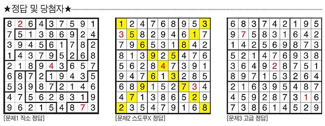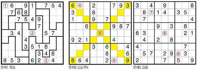 81칸 네모 속에 1부터 9까지 숫자를 집어넣습니다. 가로든 세로든 같은 숫자는 한 줄에 딱 한 번 쓸 수 있습니다. 일반 스도쿠와 스도쿠X는 작은 네모, 직소 스도쿠는 직소 모양 속에도 1부터 9까지 한 번만 쓸 수 있습니다. 스도쿠X는 노란색 대각선 블록도 1부터 9까지 숫자가 겹치지 않아야 합니다. 정답 숫자 아홉 개를 365event.chosun.com의 '주말매거진 퀴즈 코너'에 입력해 주십시오. 다섯 분을 추첨해 롯데월드 자유이용권을 4장씩 드립니다. 마감은 다음 주 화요일 오후 1시입니다.