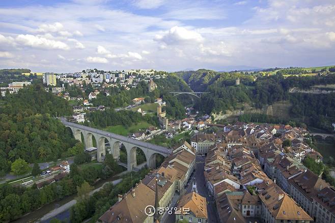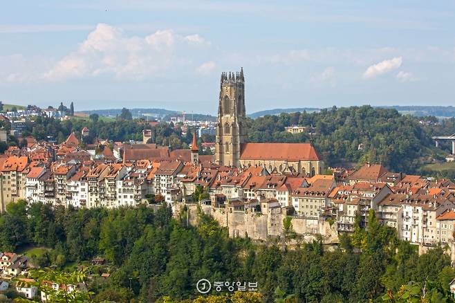 중세풍 거리 풍경으로는 프리부르(Fribourg)의 구도심도 빠질 수 없었다. 사린느(Sarine) 강이 휘감아 도는 구도심은 도시 속 섬처럼 생겼다. 스위스 수도 베른(Bern)의 풍경과 비슷했다. 12~15세기 지었다는 붉은 지붕의 건축물, 낡은 목조 다리와 성문 등이 중세 도시의 흔적을 드러내고 있었다.