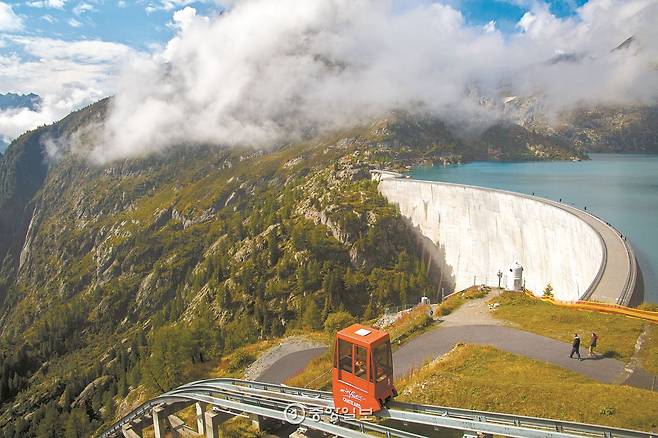 해발 1825m 고지에 케이블카가 다다르자, 이번엔 열차가 기다렸다. 놀이공원에서나 볼 법한 2m 너비의 꼬마열차였다. 열차는 깎아지른 벼랑을 따라 난 선로를 느릿느릿 달렸다. 열차가 꼬불꼬불한 굽이를 돌 때마다, 구름 사이로 알프스의 설봉이 시야에 들어왔다가 나갔다. 꼬마열차는 에모송 댐 하부에서 멈춰 섰다. 저수량이 2억2700만㎥이라고 했는데, 정말로 엄청난 몸체였다. 댐 하부에서는 미니케이블카를 탔다. 전망대에 오르니 호수와 댐이 한눈에 내려다보였다.