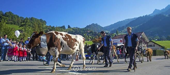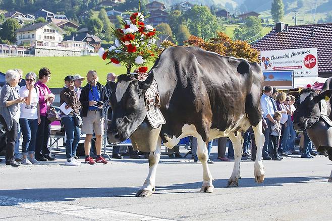 안내를 맡은 말린과 이야기를 주고 받는 사이, 마을이 요동치기 시작했다. 커다란 꽃 장식과 쇠방울을 목에 단 소떼가 늠름한 모습으로 마을로 들어서고 있었다. 소들이 발을 옮길 때마다 방울 소리가 경쾌하게 울려퍼졌다. 스위스 전통 의상을 입은 목동과 알록달록한 앞치마를 두른 소녀도 뒤를 이었다. 긴 행렬이 끝나도록 박수는 멈추지 않았다.