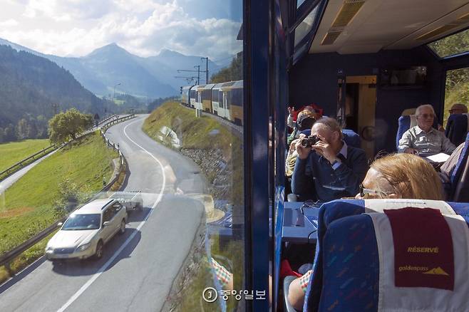 스위스 서부 소도시로 가는 길. 인천공항에서 프랑스 파리를 경유해 13시간 만에 스위스 취리히 공항에 내렸다. 기차로 다시 1시간 이동해 루체른(Luzern)에서 ‘골든패스 라인’에 올랐다. ‘빙하특급’ ‘베르니나특급’과 함께 스위스를 대표하는 테마 열차 노선이다. 알프스를 가로지르는 빙하특급(생모리츠∼체르마트)·베르니나특급(생모리츠~티라노)과 달리 골든패스 라인은 평탄한 중부지역을 횡단한다. 국토 중앙의 루체른을 떠나 서쪽의 호반 도시 몽트뢰(Montreux)까지 줄곧 완만한 초원과 너른 호수를 끼고 달린다. 알프스의 장대한 절경은 없지만 궁극의 평온함을 주는 구간이다. 그러니까 골든패스 라인은 서부로 향하는 가장 낭만적인 방법이었다.