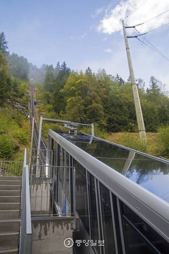 “가장 독특하면서도, 아찔하고, 신나는 열차 노선이죠.” 마티니 관광청 직원 파비앙이 말했다. 우리는 해발 1125m의 르 샤틀라르역(Le Chatelard VS)에 내려 첫 번째 케이블카를 탔다. 선로는 산등줄기를 따라 끝없이 뻗어 있었다. 비스듬한 정도가 아니라 직각에 가까운 경사였다. 파비앙이 87도의 경사가 적힌 푯말을 손가락질했다.