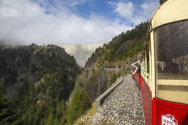 해발 1960m의 에모송 호수로 향하는 열차. 놀이공원에서나 볼 법한 꼬마열차가 깎아지른 절벽 위를 느릿느릿 달린다. 파노라마로 펼쳐지는 알프스의 풍경을 담느라 겁 먹을 틈이 없었다.