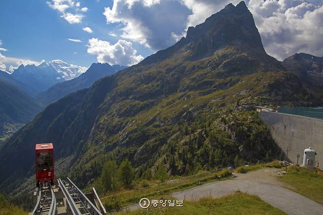 에모송(Emosson)이라는 호수로 향했다. 스위스에서도 남다른 비경으로 꼽히는 장소다. 우선 위치부터 남다르다. 에모송은 해발 1960m 산골짜기 안에 자리해 있다. 르 슈발 블랑(2831m), 르 페홍(2674m) 등 고산에서 흘러내린 물이 호수를 형성했고, 이 호숫물을 활용해 1925년 수력발전 댐을 세웠다고 한다. 한라산(1947m) 높이에 거대한 댐을 놓은 셈이다. 무엇보다 에모송 호수까지 가는 방법이 독특하다. 세 번 열차를 갈아타야 에모송을 만날 수 있다.