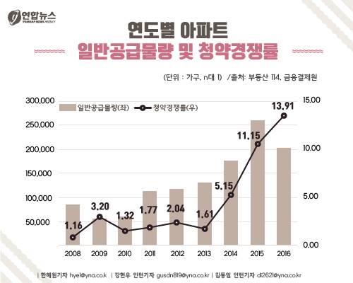 부동산114가 금융결제원 자료를 토대로 2008년 이후 매년 1월부터 10월까지 전국 아파트 청약경쟁률(1순위 기준, 특별공급 제외)을 분석한 결과 올해 평균 경쟁률이 13.91대 1로 집계됐습니다.