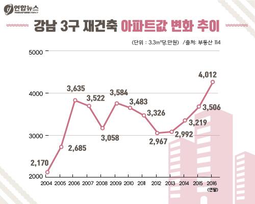 부동산114 조사에 따르면 지난 7일 기준 강남3구의 재건축 아파트값은 3.3㎡당 4천12만원. 사상 첫 4천만원대 진입입니다. 강남 3구 재건축 아파트값이 역대 최고치를 기록한 2006년의 3천635만원에 비해서도 3.3㎡당 377만원이나 높은 값입니다.