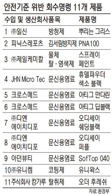 환경부는 이런 11개 제품에 대해 생산.수입업체에 판매 중단과 회수 명령을 내렸다.