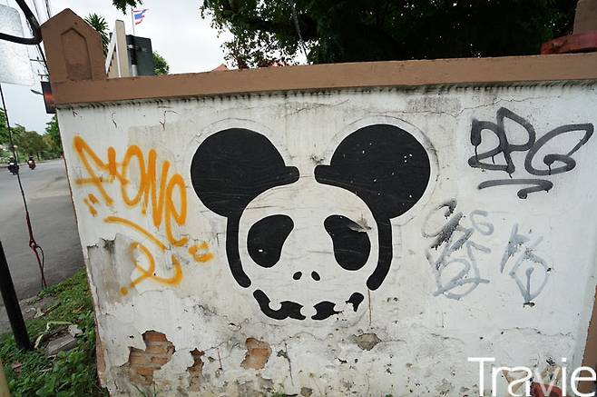 알렉스 페이스와 함께 태국을 대표하는 스트리트 아티스트 뮤 본. ‘본’은 영어로는 좋다, 태국어로는 ‘비활동적인 것은 없다’는 의미다. 그는 작품에서 ‘폭 넓은 인간사’를 다루는데 그 주인공은 인간과 동물이다. 때로는 인간과 동물이 함께 TV를 보는 일상을, 때로는 인간과 동물이 신화 속에 등장하는 한 장면을 연출하기도 한다. 또 뮤 본을 상징하는 마크인 해골 모양의 판다도 빼놓을 수 없다. 작가의 낙관인이나 서명 대신 여기저기 그려 놓은 판다의 해골 마크는 어느덧 태국 전역은 물론 세계적으로도 유명한 표식이 되어 ‘출처 없어 보이는’ 스티커 등으로 판매되고 있을 정도다.