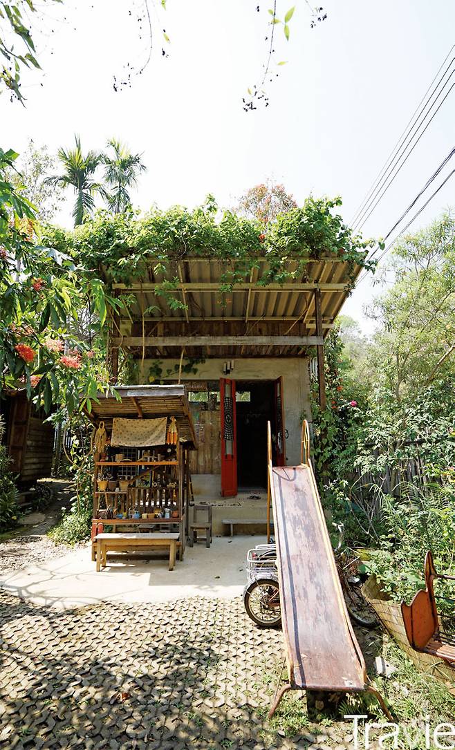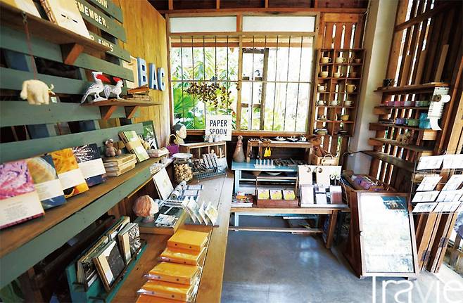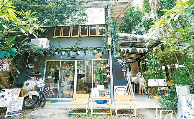 반캉왓이나 펭귄 빌라처럼 커뮤니티를 아우르는 명칭은 없지만 페이퍼 스푼을 중심으로 다양한 수공예품 상점과 예술품 가게가 공동체를 이루며 살아간다. 크고 운치 있는 정원을 가진 페이퍼 스푼. 카페 주변 도로도 붐비지 않아 간혹 들리는 자동차와 오토바이 소리, 정원 안을 돌며 지저귀는 새소리와 바람소리가 섞여 오묘한 BGM이 된다. 30년은 된 것만 같은 낡은 선풍기가 터덜터덜 돌아가고 마당을 아무렇지도 않게 돌아다니는 작은 도마뱀, 풀과 꽃을 넘나들며 우아하게 노니는 나비 사이에서 커피를 홀짝이며 그저 책만 읽어도 이곳이 낙원인 것만 같은 착각에 빠진다. 초록빛 마당을 내려다보며 사색할 수 있는 2층 공간은 더 프라이빗하다. 페이퍼 스푼 안에도 단출하지만 아기자기한 소품을 판매하고 전시하는 공간이 마련돼 있다. 수공예로 만든 문구류와 각종 나무 테이블 웨어, 집 꾸미기 좋은 소소한 장식 소품 등으로 볼거리가 가득하다.