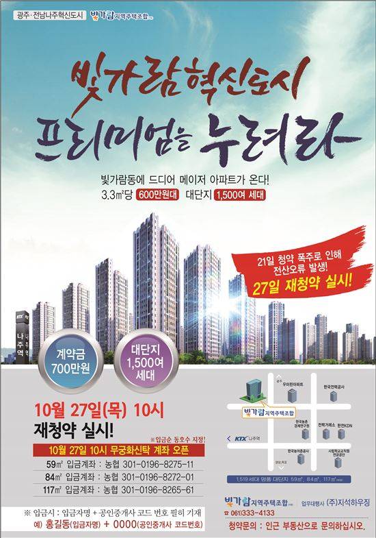 한편, 나주혁신도시에 건설을 추진 중인 빛가람지역주택조합은 지난 21일 '전산장애 발생'으로 조합원 가입 신청에 차질이 빚어진 점에 대해 사과를 표시하면서 이날 접수된 청약 신청 건은 전면 취소하고 오는 27일 청약신청 접수를 다시 하기로 결정했다.