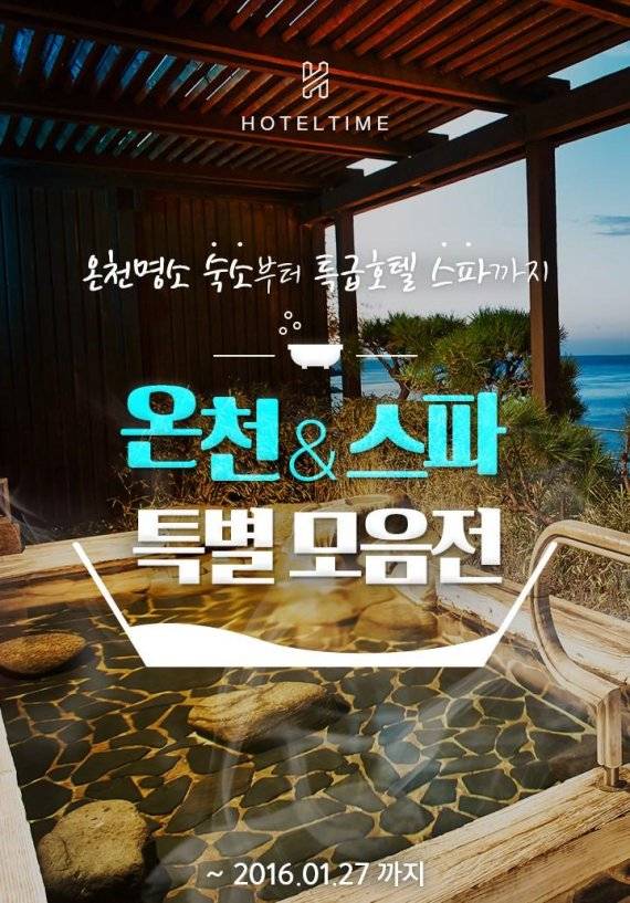 호텔타임커머스O2O 서비스 '호텔타임'은 경기와 강원, 부산, 충청, 전라, 제주지역 온천, 스파로 유명한 호텔 및 리조트를 엄선해 숙박과 부가혜택을 담은 패키지를 최대 80% 저렴하게 내놓는 '전국 온천·스파 특별 모음전'을 연말까지 실시한다. 이번 기획전은 전국 온천 명소 또는, 스파로 유명한 숙박시설들이 총출동한다. 호텔 및 리조트 숙박을 비롯해 창녕 노천온천 테마파크, 강원 탄산온천, 강원 보양 온천, 부산 허심청 온천 등 인기 온천·스파 이용권을 한데 묶은 패키지를 특가로 만난다.