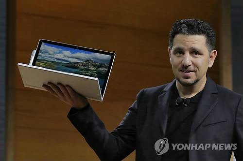 (뉴욕 AP=연합뉴스) 26일(현지시간) 미국 뉴욕의 마이크로소프트(MS) 신제품 공개행사에서 파노스 파나이 하드웨어 담당 부사장이 퍼스널 컴퓨터 '서피스 스튜디오'를 들어 보이고 있다.