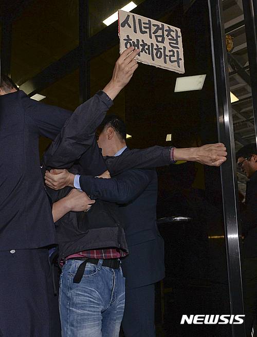 비선실세 최 씨가 서울중앙지검에 청사에 출두했던 지난 31일, 박 모씨(43)는 ‘시녀검찰 해체하라'고 적힌 손 피켓을 들고 항의했다.