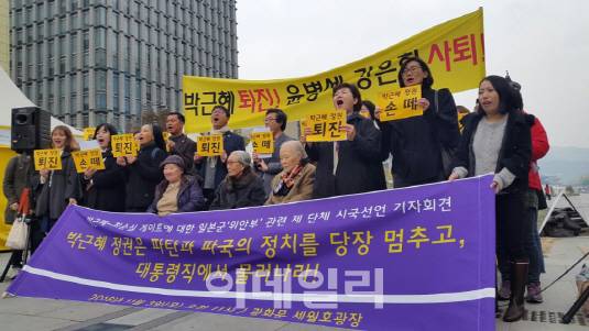 일본군 위안부 피해자 할머니들과 위안부 관련 단체들도 박근혜 대통령 퇴진을 촉구하는 시국선언에 나섰다. 위안부 피해자 길원옥(89)·김복동(91)·안점순(89) 할머니와 한국정신대문제대책협의회 등은 3일 오전 서울 종로구 광화문광장에서 ‘비선실세’ 최순실(60)씨의 국정농단 의혹 관련 기자회견을 열고 "박근혜는 파탄과 파국의 정치를 당장 멈추고 대통령직에서 물러나라"면서 이같이 밝혔다.