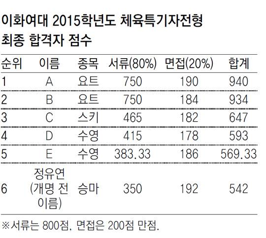 본보가 입수한 이화여대의 ‘2015학년도 체육특기자전형 합격자 서류·면접 평가 결과’에 따르면 당시 체육특기자전형에는 111명이 지원했다. ‘서류(수상 실적) 100%’로 뽑는 1단계에서 22명이 통과했는데 1명이 포기했고 2단계에서 ‘서류 80%+면접 20%’로 최종 합격자가 가려졌다. 정 씨보다 서류 점수가 50점가량 높았던 1단계 합격자 중 면접에서 낮은 점수를 받아 떨어진 사례가 있는 것으로 알려졌다.