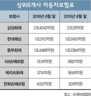 손해보험협회에 따르면 지난 6월 기준 삼성화재, 현대해상, 동부화재, KB손보, 메리츠화재, 한화손보 등 상위 6개사의 자동차보험 원수보험료는 총 7조1377억원으로 88.4%를 점유한 것으로 집계됐다. 10명 중 9명이 상위 손보사에 가입한 셈이다. 이는 전년 동기(6조596억원)보다 1조781억원 늘어난 금액으로 시장점유율도 전년 83.5%보다 4.9%포인트 상승했다.
