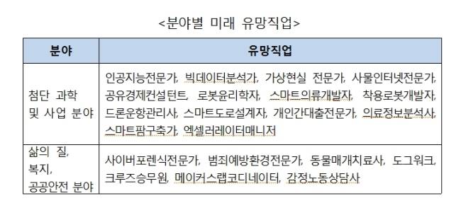 김한준 한국고용정보원 연구위원은 ‘4차 산업혁명이 미래 직업세계에 미치는 영향’이라는 주제로, 분야별 미래 유망직업 21개 직업을 소개했다. 첨단과학 및 사업 분야에서 생길 미래 유망직업으로 인공지능전문가, 빅데이터분석가, 가상현실 전문가, 사물인터넷전문가, 공유경제컨설턴트, 로봇윤리학자, 스마트의류개발자, 착용로봇개발자, 드론운항관리사, 스마트도로설계자, 개인간대출전문가, 의료정보분석사, 스마트팜구축가, 엑셀러레이터매니저(초기 창업자들의 투자 외에 비즈니스모델 개발, 교육, 컨설팅, 멘토링, 공간 확보 지원 등의 전문보육 담당) 등 14개 직업이 제시됐다. 삶의 질, 복지, 공공안전 분야에서는 사이버포렌식전문가(사이버 범죄 증거확보 위해 디지털기기 복구, 분석), 범죄예방환경전문가, 동물매개치료사, 도그워크(고객으로부터 의뢰 받은 개를 산책시킴), 크루즈승무원, 메이커스랩코디네이터(디지털공방에서 이용자가 안전하게 장비를 이용할 수 있도록 지도하고 장비 유지관리 및 안전 담당), 감정노동상담사 등 7개 직업이 꼽혔다.