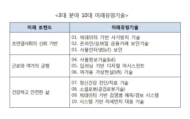 이승규 한국과학기술기획평가원(KISTEP) 연구위원은 “미래사회의 미래유망기술이 한국 사회의 삶의 만족도와 신뢰 향상에 영향을 미칠 것”이라며 KISTEP이 선정한 10대 미래유망기술을 소개했다. 이들 기술은 빅데이터기반 사기방지 기술, 온라인ㆍ모바일 금융거래 보안기술, 사물인터넷(IoT) 보안, 사물정보기술(IoE), 딥러닝기반 디지털 어시스턴트, 여가용 가상현실(VR) 기술, 정신건강 진단ㆍ치료기술, 소셜로봇(공감로봇기술), 빅데이터기반 감염병 예측ㆍ경보 시스템, 시스템기반 미세먼지 대응기술 등이다.