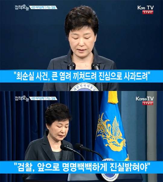 박근혜 대통령은 4일 오전 10시 30분 청와대 춘추관에서 '비선실세' 최순실 씨의 국정농단 사태와 관련한 대국민담화문을 발표했다. 특히 최순실씨와의 친분 및 국정 개입 의혹과 관련해서 "청와대에 들어온 이후 혹여 불미스러운 일이 생기지는 않을까 염려하여 가족 간의 교류마저 끊고 외롭게 지내왔다. 홀로 살면서 챙겨야 할 여러 개인사들을 도와줄 사람조차 마땅치 않아서 오랜 인연을 갖고 있었던 최순실 씨로부터 도움을 받게 되었고, 왕래하게 됐다"고 해명했다. "무엇으로도 국민들의 마음을 달래드리기 어렵다는 생각을 하면 내가 이러려고 대통령을 했나 라는 자괴감이 들 정도로 괴롭기만 하다. 국민이 마음을 아프지 않게 해드리겠다는 각오로 노력해왔는데 이렇게 정반대의 결과를 낳게 되어 가슴이 찢어지는 느낌이다. 심지어 제가 사이비 종교에 빠졌다거나 청와대에서 굿을 했다는 이야기까지 나오는데 이는 결코 사실이 아니라는 점을 분명히 말씀드린다"고 해명했다.