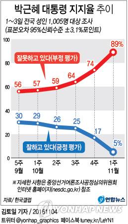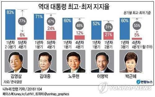 박근혜 대통령의 국정 지지도가 이른바 '최순실 국정개입 파문'의 영향으로 5%까지 떨어져 역대 대통령 가운데 최저치를 기록했다고 여론조사 전문업체 한국갤럽이 4일 밝혔다. 박 대통령의 국정지지율은 2013년 취임 초기 인사 난맥을 겪으며 40%선에 머물다가 그해 5월 초 처음으로 50%를 넘었고, 그해 9월 둘째 주에는 67%라는 최고치를 기록한 바 있다.