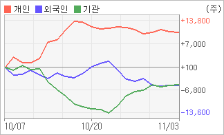 | 외국인과 기관은 순매도, 개인은 순매수(한달누적) 11월2일부터 전일까지 기관과 외국인은 2거래일 연속 동반 순매수를 보였다. 4주간을 기준으로 보면 외국인이 순매도로 돌아서면서 5,265주를 순매도했고, 기관도 매도 우위를 보이면서 5,155주를 순매도했지만, 개인은 오히려 매기를 떨어뜨리면서도 10,420주를 순매수했다. |