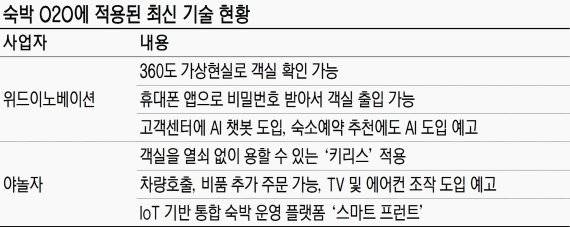 4일 관련업계에 따르면 국내 대표적인 숙박 O2O 사업자인 위드이노베이션과 야놀자는 잇따라 숙박업소에 사물인터넷(IoT) 시스템을 구축, 이용자들의 편리한 숙소 이용과 점주들의 객실관리를 돕고 있다. 이용자가 사진과 다른 객실에 실망하는 일이 없도록 하기 위해 360도 가상현실(VR)로 객실을 미리 살펴볼 수 있도록 하는 서비스도 도입됐다.