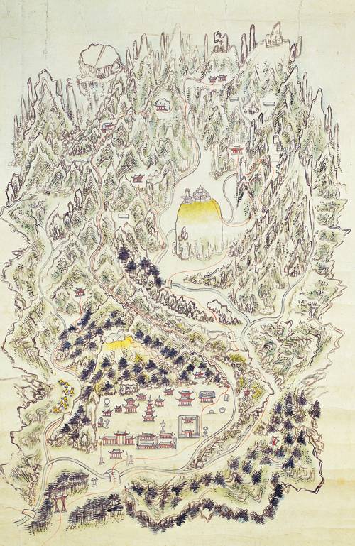 | 순조의 태실이 있는 충북 속리산의 모습을 담은 ‘순조태봉도’. 그림의 가운데 부분에 그릇을 엎어놓은 듯 볼록 솟아오른 언덕이 보이고, 그 위에 설치한 태실의 석물이 눈에 띈다. 조선왕실의 태실문화는 생명의 탄생을 축복하고, 왕실의 안정과 번영을 기원하는 것이었다. |
