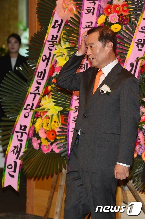 (서울=뉴스1) 민경석 기자 = 5일 오후 서울 서초구의 한 호텔에서 열린 김병준 신임 국무총리 후보자 차녀의 결혼식에서 김 후보자가 문재인 전 더불어민주당 대표가 보낸 화환 옆에 서 하객을 맞이하고 있다. 2016.11.5/뉴스1