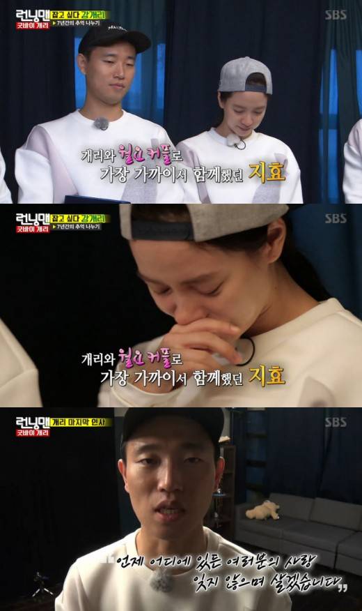 개리와 ‘월요커플’로 케미를 뽐냈던 송지효 역시 끝내 눈물을 흘렸다. 송지효의 선물은 월요커플의 사진이 담긴 앨범이었다. 따로 남긴 편지에서 송지효는 “난 너무나도 당연하게 언제일지 모르는 마지막까지 우리가 함께일 거라고 믿고 있었다. 강개리가 없어서 마음이 아리고 쓸쓸하겠지만 그래도 씩씩하게 잘 하고 있을게”라고 애틋하게 말했다.