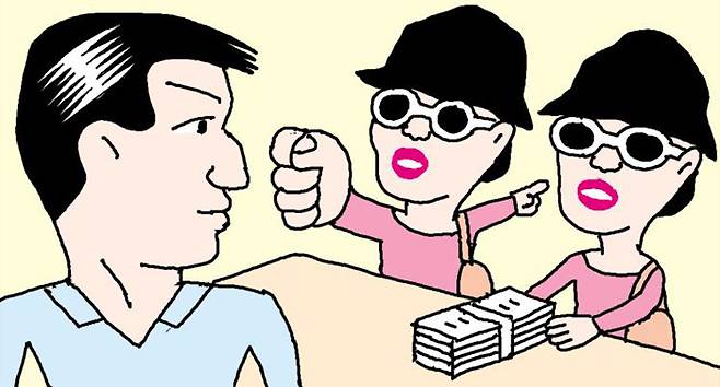 지난해 7월 서울 강남 학동사거리 근처의 한 굴비 음식점. 폭력조직 간부 A씨가 중년 여성 두 명을 만나 점심식사를 했다. 모임은 A씨의 지인이 다리를 놓아 이뤄진 것이었다. 두 여성은 자매관계라고 자신들을 소개했다. 명품 옷에 가방을 든 자매는 언행에 거침이 없었다.