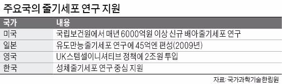 각국 정부는 줄기세포 연구의 가능성을 높게 보고 지원을 강화하고 있다. 미국은 매년 6000억원 이상을 신규 배아 줄기세포 연구에 투입한다. 일본은 유도만능줄기세포를 이용한 임상 연구에 들어갔다. 중국도 치료 목적의 배아복제 연구를 허용했다. 시장조사업체 프로스트&설리번은 2013년 400억달러이던 줄기세포 관련 시장은 연평균 24.1% 성장해 2018년 1176억달러로 확대될 것으로 예상했다.