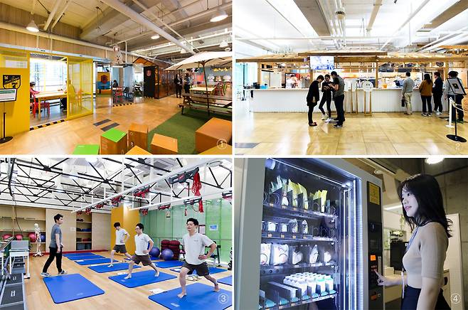 4층 엘리베이터 문이 열리자 시끌시끌한 소리가 들렸다. 200여명의 사원이 1800㎡(약 545평) 남짓한 카페테리아 공간에서 삼삼오오 짝을 지어 대화를 나눈다. 아메리카노 가격은 700원. 은행과 24시간 편의점, 여행사와 보험사도 입주해 있다. 한 층 올라가니 복지 시설이다. 사내 병원인 '홈닥터'에선 적외선 물리치료 기기에서 손을 쬐고 있는 직원 둘이 보이고, 바로 옆 모유 수유실엔 '모자유친 방'이라는 간판이 걸려 있다. '코어센터'에선 여성 직원 넷이 트레이너로부터 자세 교정을 받고 있었다. 게시판엔 필라테스·서킷 트레이닝 강의 목차를 정리해둔 종이가 보였다. 자세 교정 수업을 마치고 나온 여지원씨는 "잘못된 자세로 장시간 앉아 있다가 골반 균형이 틀어져 한 달째 교정을 받고 있다. 앉아서 일하는 직업이라 사원 다수가 주기적으로 이 치료를 받는다"고 했다.