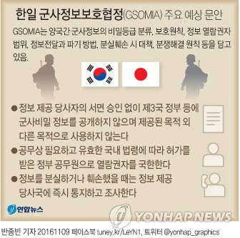 양국은 ▲정보 제공 당사자의 서면 승인 없이 제3국 정부 등에 군사비밀 정보를 공개하지 않으며 제공된 목적 외 다른 목적으로 사용하지 않는다 ▲공무상 필요하고 유효한 국내 법령에 따라 허가를 받은 정부 공무원으로 열람권자를 국한하고 ▲정보를 분실하거나 훼손했을 때는 정보 제공 당사국에 즉시 통지하고 조사한다는 내용 등으로 협정 문안을 만드는 것으로 알려졌다.