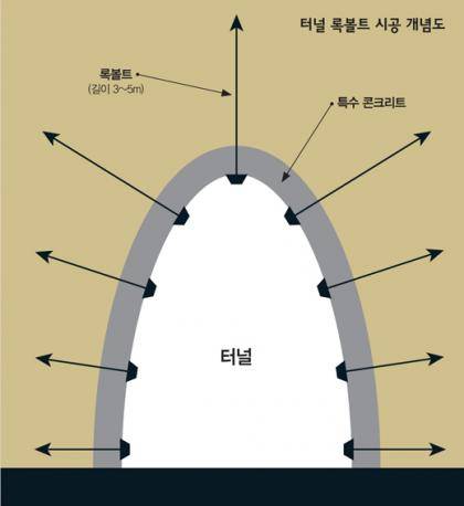 터널강관은 암반에 뚫은 구멍을 메우는 보강재다. 아치모양의 터널 천장과 벽면 안쪽에 보이지 않는 3~5m의 철근 수만개가 고정돼 암반 붕괴를 막아준다. 이 재료를 ‘록볼트’(Rock Bolt)라고 하는데 국내 터널공사 중 약 90%가 11개 업체에서 생산하는 일반록볼트를 사용하고 그 외 5~6개 종류가 더 있다.