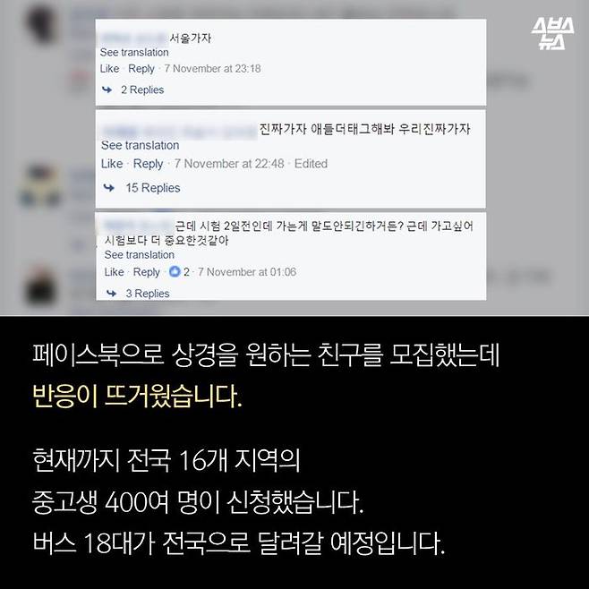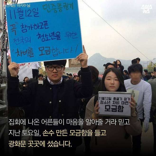 지난 5일 광화문 촛불집회 한 가운데서 중고등생들이 피켓을 들고 돈을 모금했습니다. 서울에 올라와 집회에 참여하고 싶어하는 전국 각지 학생들의 차비를 모금한 건데요. 7시간 만에 4000만원이 넘는 거금이 모였습니다. 어떻게 된 일인지 학생들의 얘기를 직접 들어봤습니다.