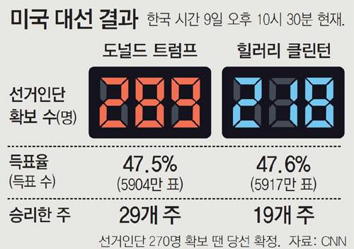 ‘미국 우선주의(America First)’를 전면에 내걸고 대외적 고립주의와 보호무역주의를 주창해 온 공화당 도널드 트럼프 후보(70)가 예상을 뒤엎고 제45대 미국 대통령에 당선됐다. 부동산 재벌이자 정치 경험이 전무한 ‘워싱턴 아웃사이더’ 트럼프가 대통령 부인과 상원의원, 국무장관을 거친 클린턴을 누른 것은 기성 워싱턴 정치에 분노하고 중산층이 붕괴된 미국 사회에 절망한 백인 노동자(앵그리 화이트)들의 변화 요구에 따른 것이다.