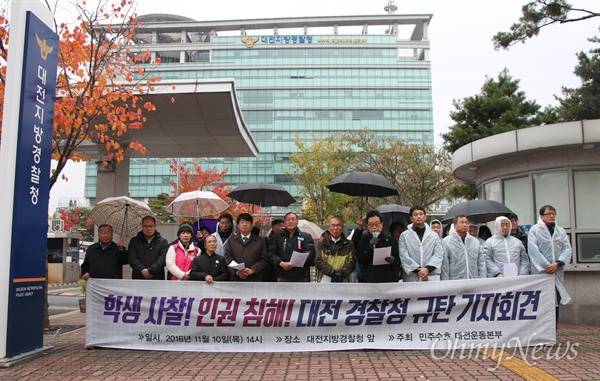 매일 저녁 '하야하라 박근혜 대전시민 촛불행동'을 주최하고 있는 '민주수호대전운동본부'는 10일 오후 대전지방경찰청 앞에서 기자회견을 열어 "학생사찰 인권유린 대전경찰청장은 사과하라"고 촉구했다.