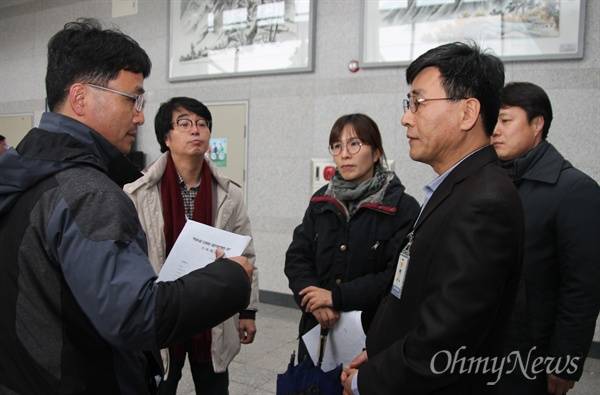 | ▲ 경찰이 촛불집회에 참여한 학생들을 사찰했다는 의혹과 관련해 대전지역 단체들이 10일 오후 대전경찰청 앞에서 규탄 기자회견을 열고 김덕섭 대전경찰청장의 사과를 촉구했다. 사진은 기자회견 후 경찰 관계자(오른쪽)에게 항의서한을 전달하고 대전경찰청장의 입장표명을 요구하고 있는 민주수호대전운동본부 상황실 관계자들. |