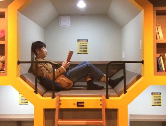 깔끔한 외관과 책을 읽기에 부담스럽지 않은 은은한 조명이 고급스럽다. 내부에는 편안한 소파와 벌집모양의 방들이 나란히 줄지어 서있다.