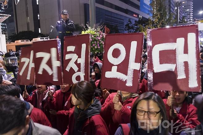 | ▲ 지난달 29일 서울 청계광장에서 진보성향 단체들로 구성된 민중총궐기 투쟁본부가 주최한 집회에서 참가자들이 피켓을 들고 있다. 사진=이치열 기자. |
