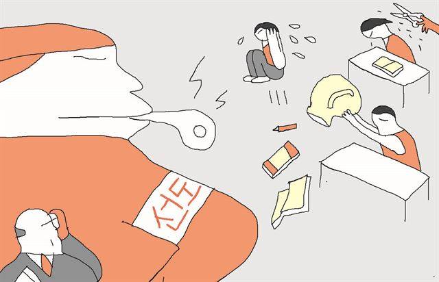 9월 새 학기 수업이 한창이던 서울 강북의 한 사립고등학교 1학년 교실 앞 문이 벌컥 열렸다. 학생 10여 명이 버티고 서 있었다. 수업 중이던 교사도 있었지만 이들은 거침없이 들어와 학생들 가방을 뒤지기 시작했다. “불시에 검사해야 학생들이 문제가 될 물건을 숨기지 못한다”고 밝힌 이들은 선도부 학생들이다. 누구도 토를 달지 못했다. 서울시교육청은 이런 사실이 지난달 학생인권침해 사항으로 접수되자, 학생 동의 없는 그리고 선도부 학생에게 위임하는 소지품 검사 관행을 시정하라고 해당 학교에 권고했다.