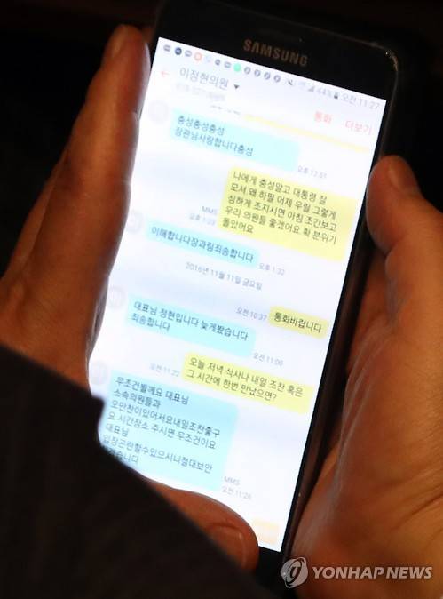 (서울=연합뉴스) 배재만 기자 = 국민의당 박지원 비상대책위원장 겸 원내대표가 11일 이른바 '최순실 게이트'의 진상을 규명하기 위한 긴급현안질문이 열린 국회 본회의장에서 새누리당 이정현 대표가 보내온 문자를 확인하고 있다. 2016.11.11