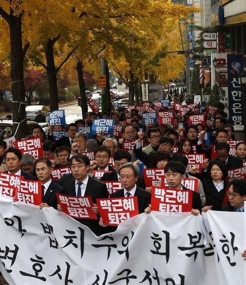 ‘전국 변호사 비상시국모임’은 이날 서울 서초동 변호사회관에서 시국선언문을 발표하고 박 대통령의 퇴진과 국정농단에 가담한 자들의 처벌을 요구했다.
