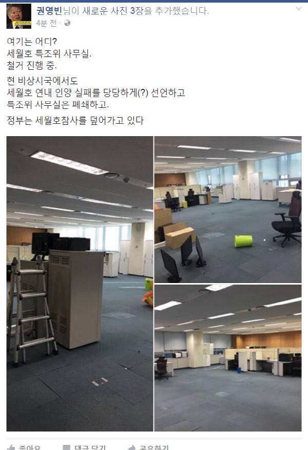 세월호특조위 권영빈 상임위원은 11일 자신의 페이스북에 “여기는 어디? 세월호 특조위 사무실. 철거 진행 중. 현 비상시국에서도 세월호 연내 인양 실패를 당당하게 선언하고, 특조위 사무실을 폐쇄하고 정부는 세월호 참사를 덮어가고 있다”고 썼다.