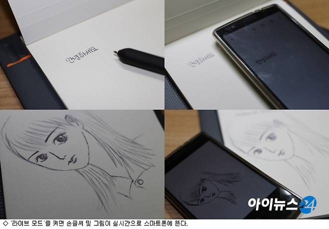 설정에 들어가 '라이브 모드'를 켰다. 이 기능은 종이 위에 쓴 모든 내용이 스마트폰 화면에 똑같이 표시되게끔 해 준다. 펜촉의 움직임을 따라 사용자가 제작한 글이나 그림을 실시간으로 스마트폰 화면에 띄운다. '안녕하세요'라고 글씨를 써 봤다. 스마트폰을 보니 똑같은 글씨가 써 있는 게 신기했다.