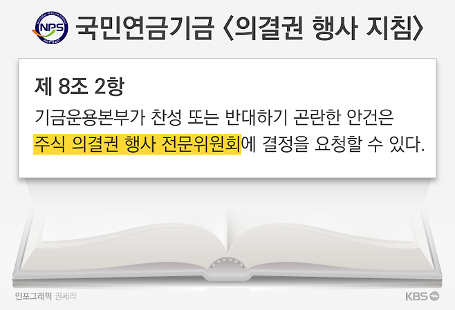 국민연금의 의결권 행사 결정은 내부 인사들로 구성된 투자위원회에서 이뤄지지만, 논란이 있을 수 있는 사안에 대해서는 외부 전문가들로 구성된 '의결권 행사 전문위원회'를 거쳐 결정이 내려지는 경우가 많습니다. 공식적인 의결권 행사 지침도 이를 뒷받침하고 있습니다.